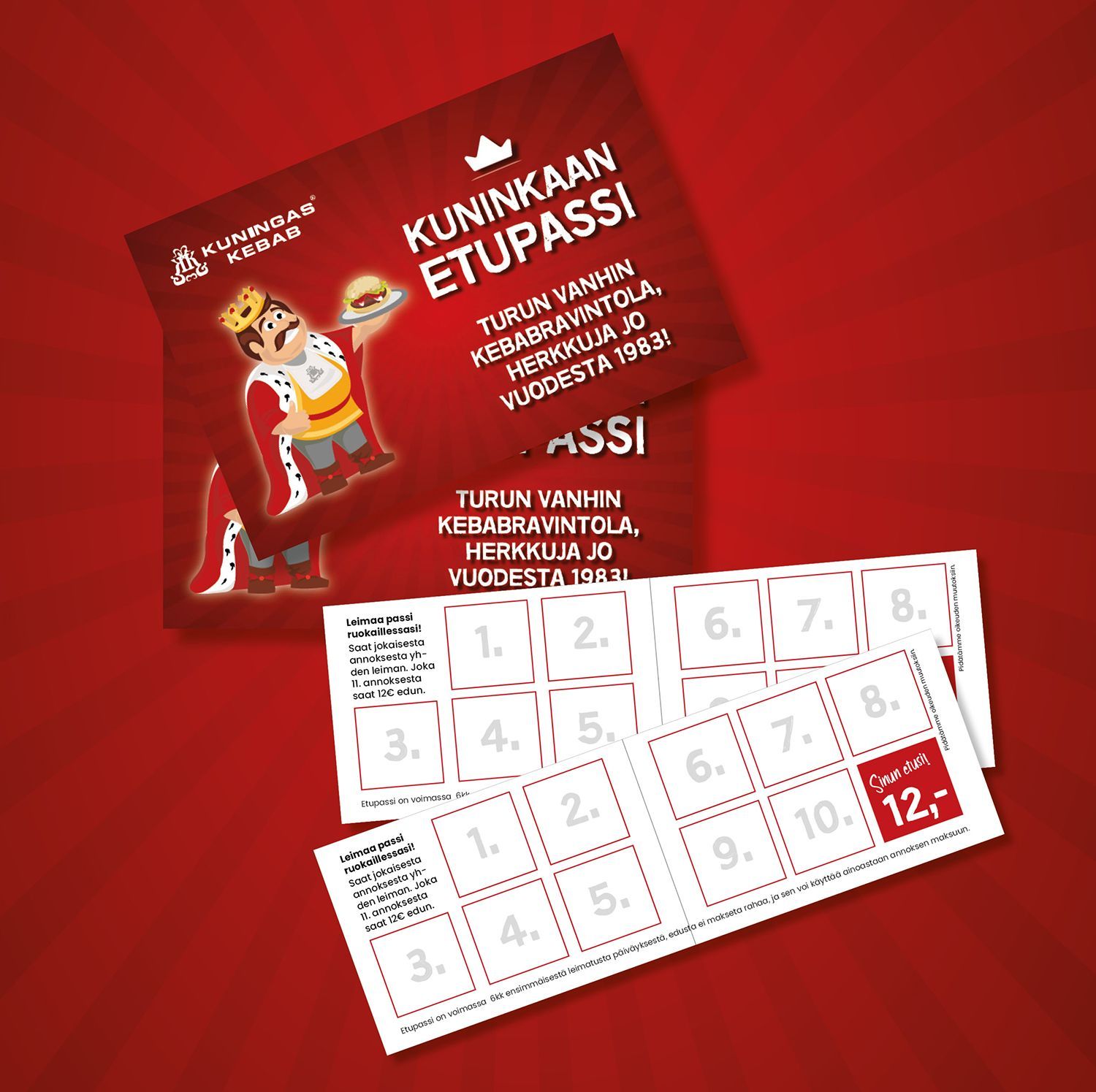 TULE RAVINTOLAAN NOUTAMAAN OMA KUNINKAAN ETUPASSI, LEIMAA PASSI AINA RUOKAILLESSASI,SAAT JOKA-IKISESTÄ ANNOKSESTA AINA YHDEN LEIMAN, KERÄÄ KYMMENEN LEIMAA JA SAAT 12 EURON EDUN JOKA 11. KERRALLA.